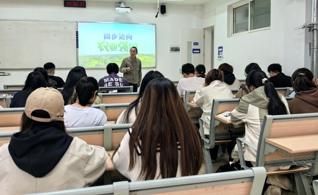 课堂上,刘校长从国家战略高度出发,结合党的二十大报告中关于农业农村工作的部署,深刻阐述了做好“三农”工作、建设农业强国的重大意义,指出农业强国是社会主义现代化强国的根基。他通过详实的数据和生动的案例,深入浅出地讲解了我国粮食安全现状、农业科技发展、现代农业经营体系构建以及农业国际合作等方面内容,帮助同学们理解农业在国家发展全局中的基础性、战略性地位。