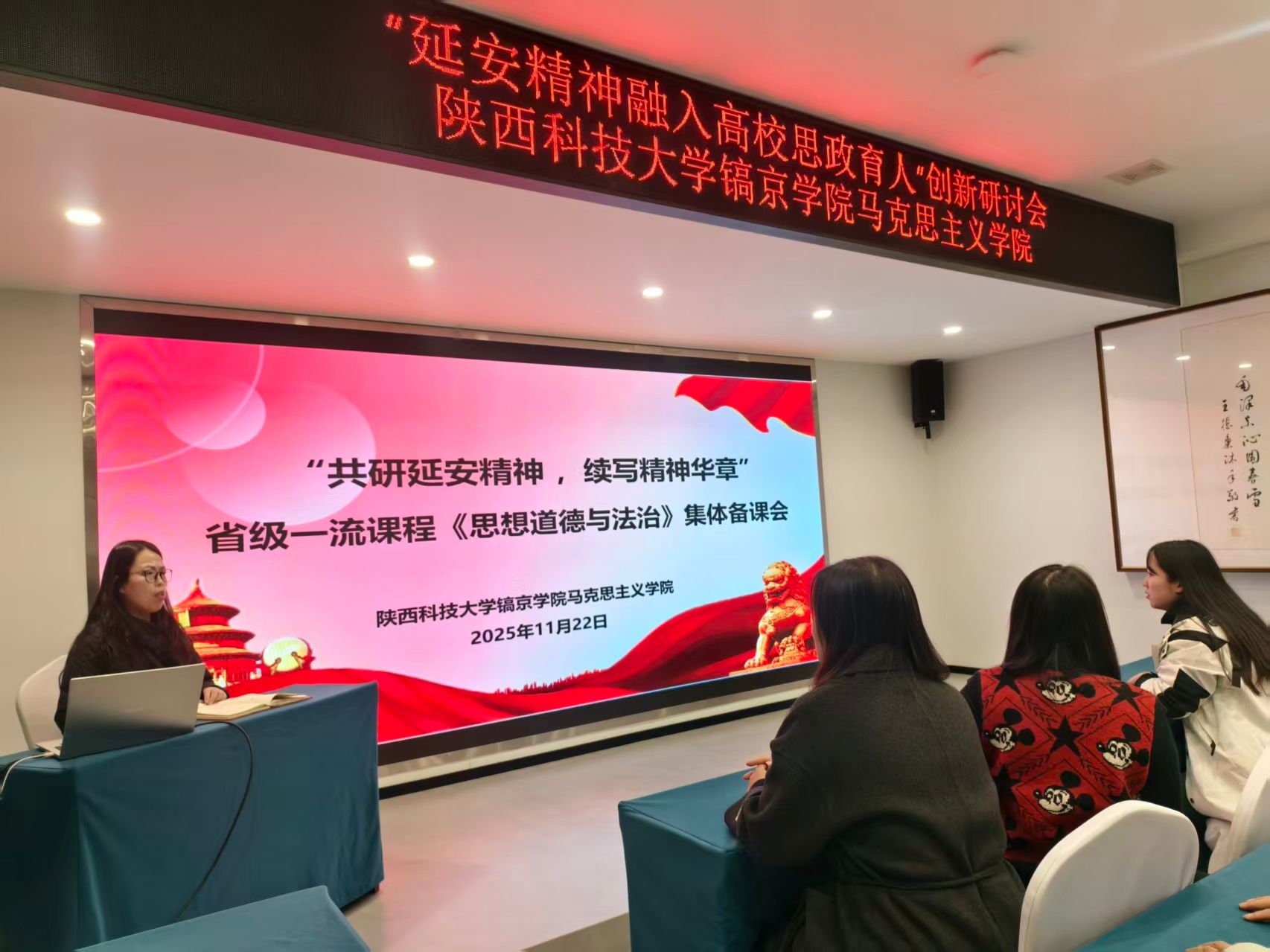 首日实践活动结束后,学院思政德育教研室的全体教师召开“延安精神融入高校思政育人”创新研讨会。研讨会上,老师们结合当日实地研学的感悟体会,以及张茁老师专题授课的经验启示,围绕 “如何将延安精神有机融入思政课堂教学”“如何创新红色实践育人模式”“如何深度挖掘红色资源的教育价值”“如何提升思政课的吸引力与感染力” 等核心问题展开深入研讨。经过充分交流与思想碰撞,老师们达成广泛共识,形成了“理论教学 + 实地体验 + 案例解析 + 实践创作” 的一体化育人新思路,为学院后续思政课程改革与育人模式创新提供了有力支撑。